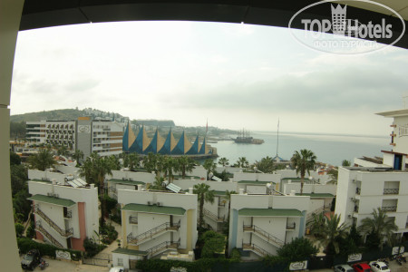 У нас был забронирован номер типа Standart seaside view. Окна номера выходят на соседние отели Maria Hotel и Adin, вид на море боковой но так же видно довольно красивую бухту отеля Adin где швартуются прогулочные кораблики.