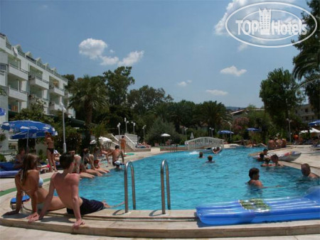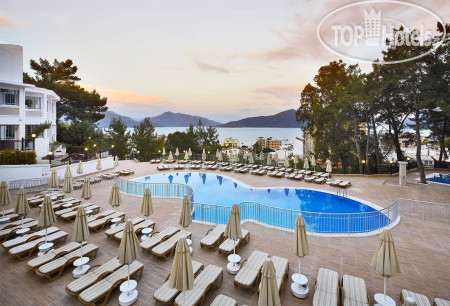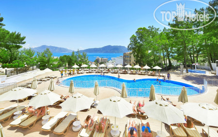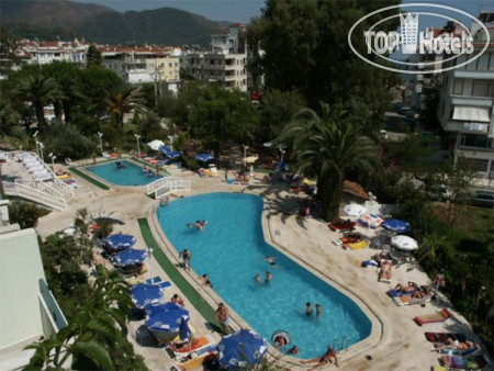 Второй год отдыхаю в этом отеле. Из плюсов нравится его расположение. До пляжа идти минут 5, до центра Мармариса минут 30 или можно доехать за 30 лир на автобусе, который ездит часто. Еда несколько однообразная, но вкусная. Персонал дружелюбный, начинают учить русский язык). Из минусов крутой подъем к отелю и на старой территории. В прошлом году были недостатки в номере, но вполне решаемые. В этом году я была в некотором шоке. При заселении нам с младшим сыном (19лет, на минуточку) выделили номер в одной двуспальной кроватью и сказали, что других номеров нет! Хорошо, что смогли поменяться номерами со старшим сыном и невесткой. В итоге жили мы в домике на самой верхней части отеля. Вид из окна и с балкончика прекрасный, на море. Сам номер вполне удобный. Немного ниже расположен бассейн, бар и анимация. Музыка орала дурниной до 23:20, хорошо, что взяла беруши. Шокировала щель во входной двери, заткнутая частично бумагой. В санузле есть душ, отделенный от унитаза стеклянной стеночкой, пол практически ровный и при мытье вода разливается по всей ванной комнате. После можно уже вплавь добираться до унитаза. Хотела на следующий день высказаться на ресепшен по этому поводу, отель все-таки позиционируется как 4 звезды, а не 2. НО! Все недостатки померкли, когда оказалось, что туристов, приехавших вечером, вообще не заселили! Номеров, видите ли, нет! И спали эти бедолаги на ресепшен под пледами. И на следующий день, и через день приехавших вечером туристов не заселяли в номера, пока они не освободятся. И, как оказалось, туроператор ( я ездила от Пегас Туристик) в курсе этой проблемы, но вот только не предупреждает своих клиентов о ней. Короче, я поняла, что проблемы в номере это фигня, счастье, что меня заселили сразу. Но больше в этот отель не поеду.