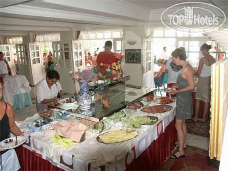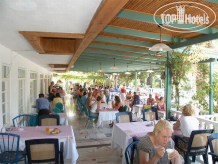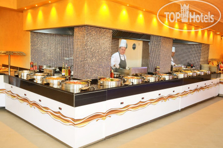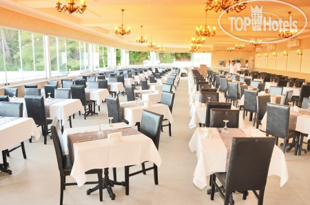 Ресторан большой. С красивым видом на горы и море. Питание нормальное. Сытно. Через несколько дней понял, что все это повторяется каждый день с небольшими изменениями, главные блюда. Салаты и закуски всегда те же. Завтрак всегда одно и тоже- яичница, омлет, выпечка, сыр, мюсли. Тарелки не всегда чистые. Официанты работают быстро. Воду в бутылках можно взять у бармена, правда не всем хватало её. Бармен ресторна - выше всяких похвал! Позитивный, улыбчивый, доброжелателен! Очень приятный человек!